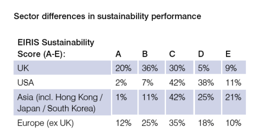 The EIRIS research also ranked corporate sustainability performance by geographic region, with companies from the United Kingdom getting the greatest number of A grades, while only 2% of U.S. companies received an A. The vast majority (91%) of U.S. based companies received a C or lower grade.