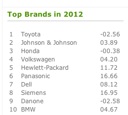 In a statement, Interbrand reports: “Automotive and technology brands dominate the ranking. Toyota maintains the number one spot, continuing to make environmental sustainability a core management priority. The original Prius model — the primary launchpad for Toyota’s green image — has recently been expanded to encompass an entire family of sustainable automobiles, including the company’s first plug-in model. This year, Toyota also achieved near zero-landfill status at all of its North American manufacturing plants, and continues its commitment to build LEED certified buildings and dealerships.”