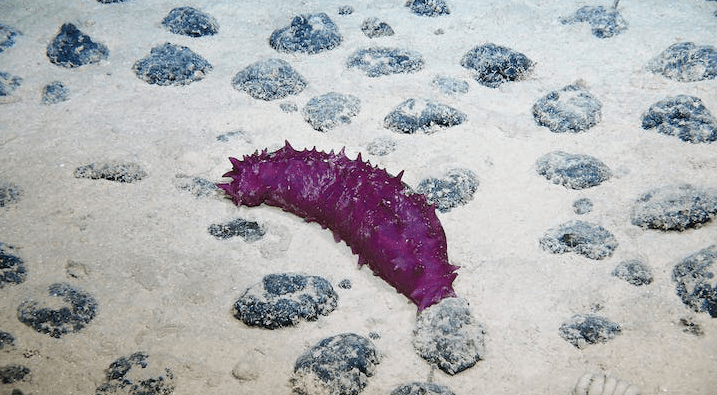 Brightly colored sea cucumbers and many other unusual deep sea creatures live among the nodules in the Clarion-Clipperton Zone. ROV KIEL 6000/GEOMAR