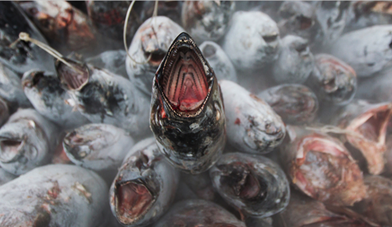 Frozen albacore tuna on a fishing boat in the Pacific Ocean. Tuna is stacked and weighed before being shipped for processing into canned tuna. Image © Paul Hilton / Greenpeace.