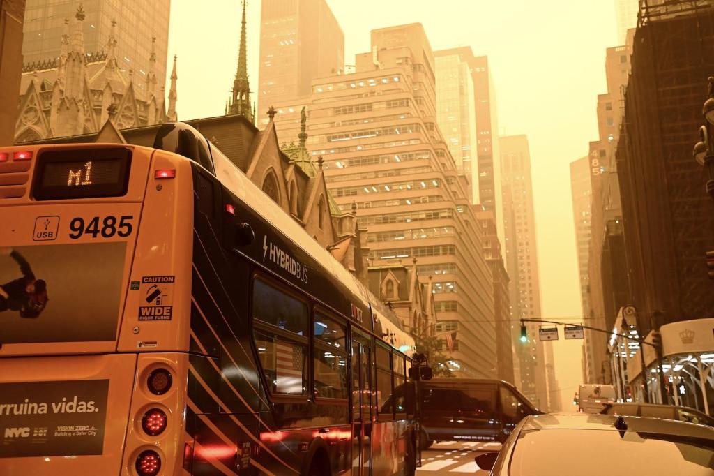An orange hue tints New York City on June 7 as smoke from more than 100 wildfires across Quebec, Canada, filters south. Wildfire seasons are starting earlier, lasting longer and causing more damage due to climate change, scientists say. (Image: Metropolitan Transportation Authority/Flickr)