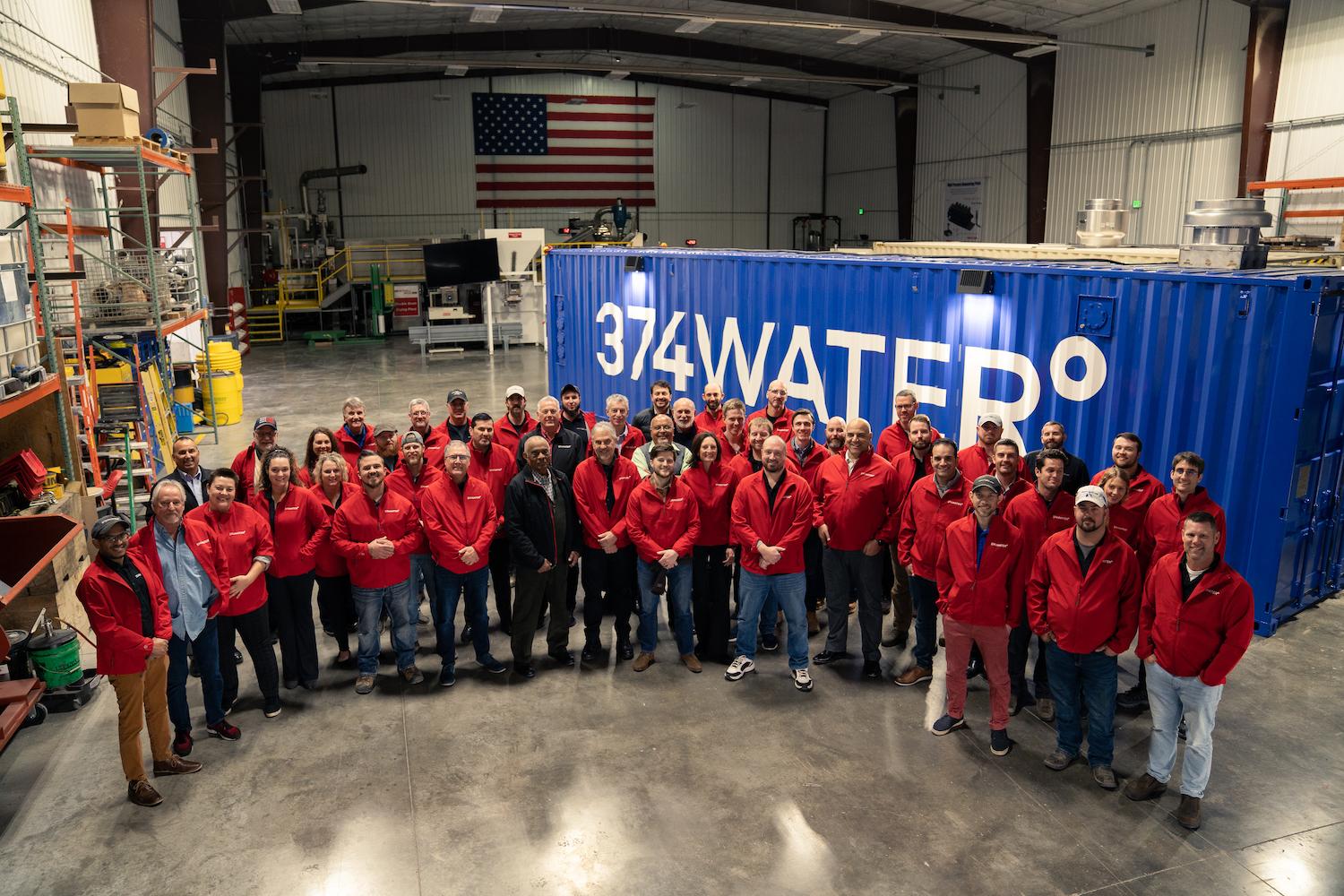 The team at North Carolina-based 374Water show off their prized invention. The container behind them may not look like much, but it can eliminate PFAS from up to 1 million gallons of wastewater per day. Image: 374Water