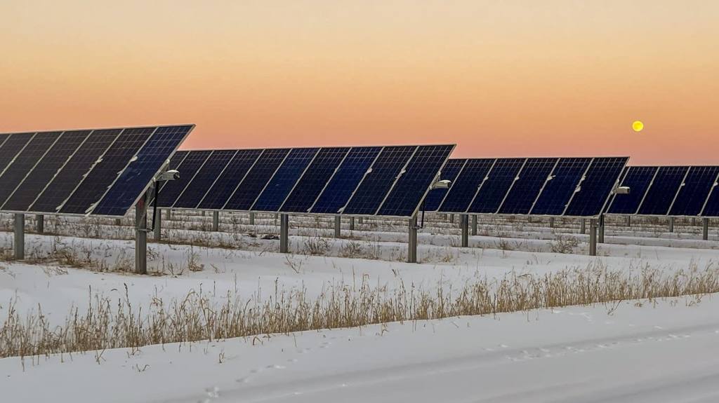 Solar panels gleam in the late-afternoon light at the Sylvan solar project just west of Brainerd on Dec. 7. Minnesota Power recently built the 15.2-megawatt project and two others in Hoyt Lakes and Duluth as part of its effort to increase its solar capacity. Photo: Kirsti Marohn | MPR News